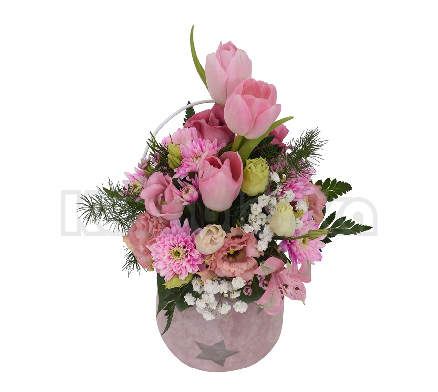 Aranžman napravljen sa nežno roze prolećnim cvetovima je idealan za nežnu osobu, da joj ulepšate dan, unesete prolećnu svežinu i osmeh u kućni ili poslovni prostor. Bilo da želite da je iznenadite za rođendan, godišnjicu, 8. Mart ili neku drugu posebnu priliku ovaj aranžman je pravi izbor.