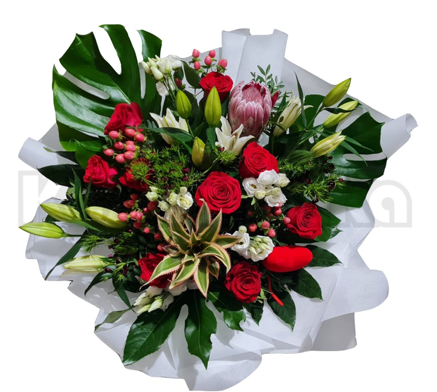 Buket je napravljen od egzotičnih cvetova protee, ananasa, crvenih ruža, ljiljana, lizijantusa sa bogatom dekoracijom. Ukoliko želite da očarate dragu damu, egotična kombinacija je savršen poklon.
