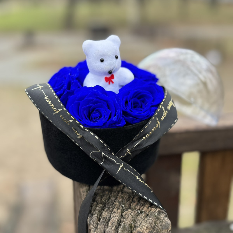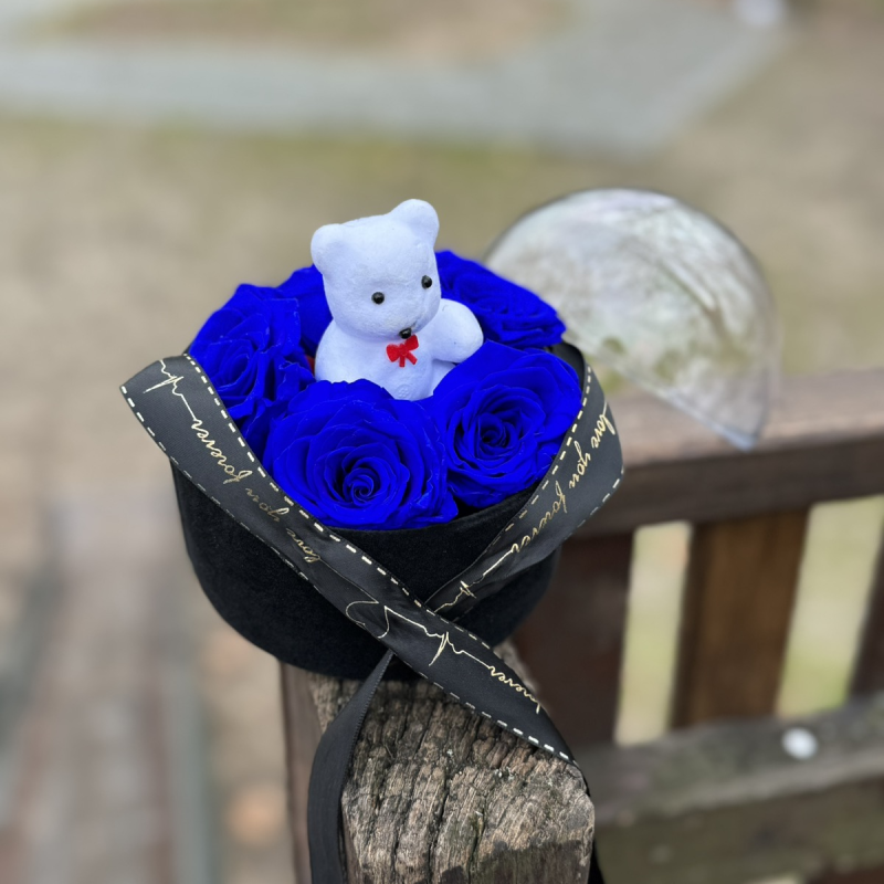 Pažljivo odabrane plave dehidrirane ruže smeštene u dekorativnu kutiju sa belim medvedićem, savršen spoj estetike i dugotrajnosti. Idealan izbor za one koji žele poklon koji traje.
