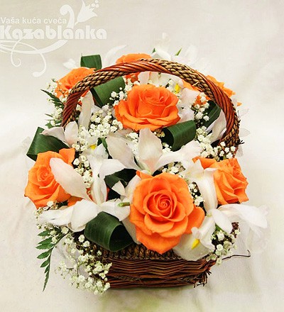 Cvetno šarenilo daće uvek lepu draž svakom venčanju. Na vama je samo da se prepustite svojoj mašti i uživate u svemu što vam cveće pruža. Cveće i razni aranžmani od cveća nikada ne izlaze iz mode. Možete se opredeliti za klasičan stil, isto kao i za neki u trendu. Potpuno je svejedno za šta se odlučite jer će vam cveće uvek pružiti neverovatno zadovoljstvo. Jarke boje mogu biti divne, pa je Aranžman narandžaste ruže, beli irisi sa zelenilom u korpici veoma dobar izbor u ovom slučaju.