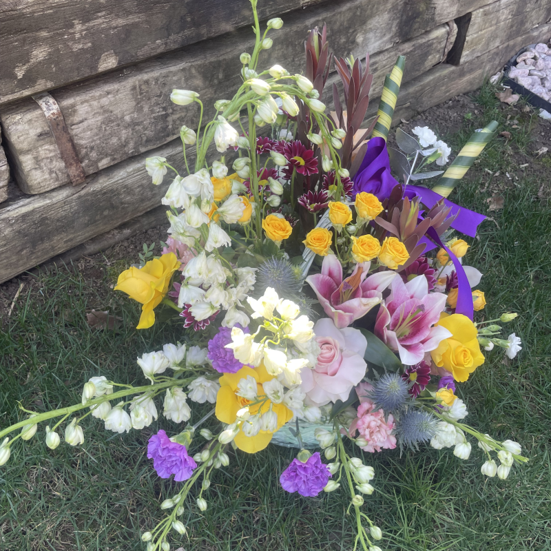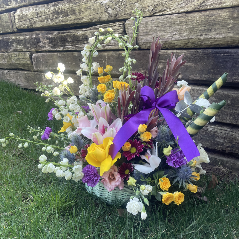 Raskošan aranžman od šarenog svežeg cveća aranžiran u korpi. Idealan izbor za poklon za posebne prilike, rođendan ili 8. mart.