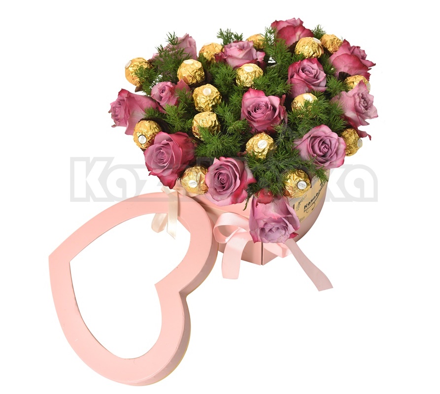 Romantični aranžman je napravljen sa lila ružama i ferrero kuglicama u kutiji koja je u obliku srca. Lila ruže simbolizuju ljubav, zahvalnost i poštovanje, ali isto tako lila ruže se poklanjaju ukoliko se neko zaljubili na prvi pogled, stoga ako ste jedan od tih, ovaj aranžman je savršen izbor da poklonite dragoj dami za Dan zaljubljenih, rođendan, 8. mart ili neki drugi njoj poseban dan.